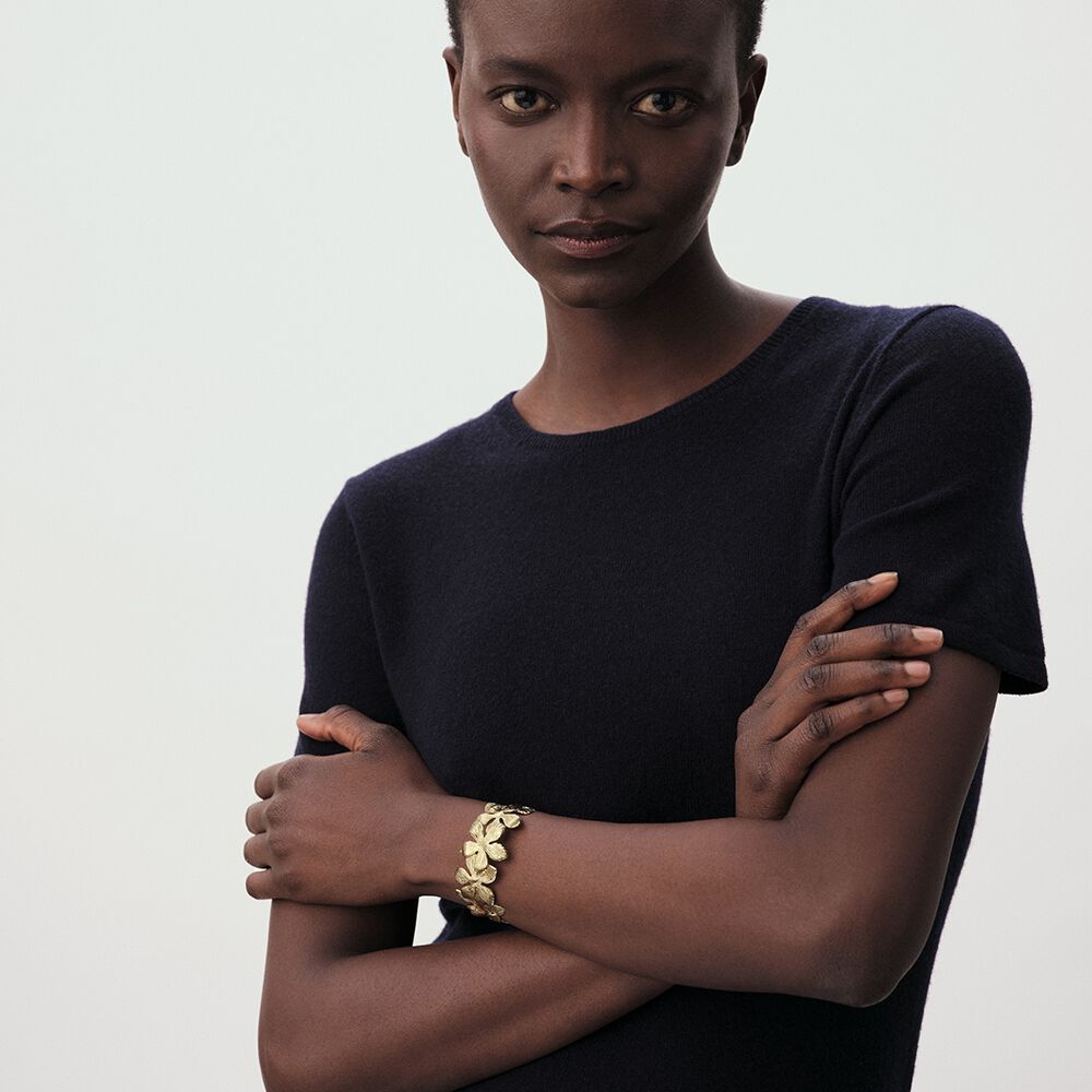 Manchette en métal doré l'or fin avec une superposition de fleurs d'orchidée.