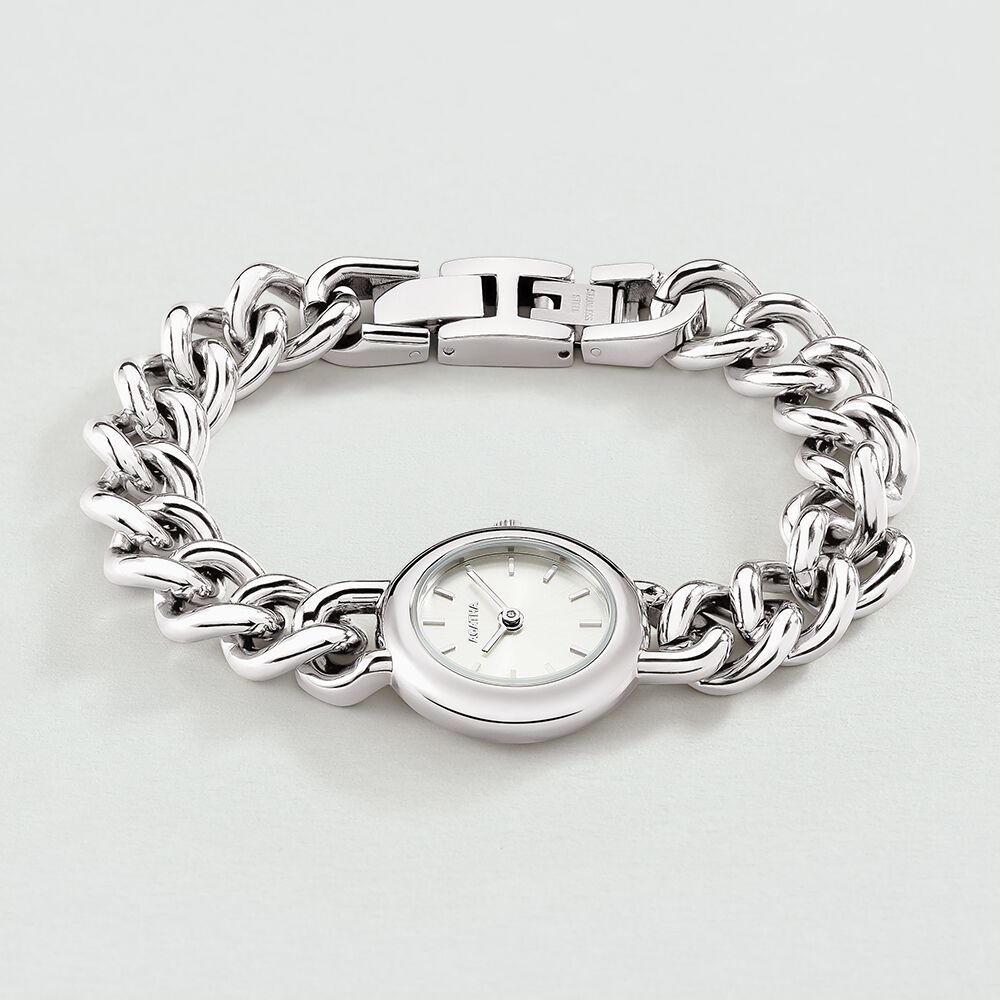 Montre en acier inoxydable, chaine gourmette et boitier rond de 25mm de diamètre au look vintage, fond de cadran rayonnant, étanchéité de 5ATM, mouvement Quartz. Rallonge individuelle supplémentaire disponible à la vente sur ce site. Ce bijou mesure 170mm et contient une rallonge de 15mm