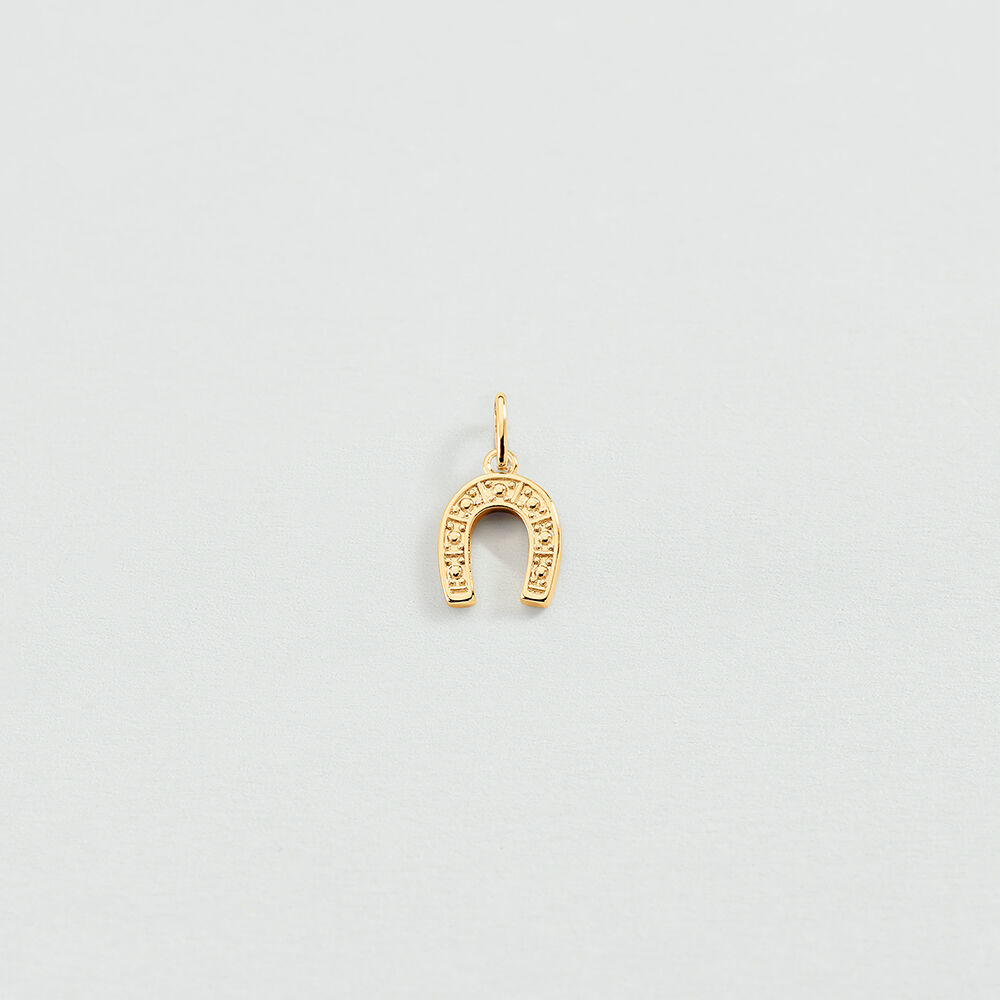 Pendentif charm fer à cheval en laiton doré à l'or 750/1000 serti d'oxydes de zirconium verts. Créez votre bijou unique et personnalisé en l'associant à d'autres pendentifs charms et à la chaîne de votre choix..