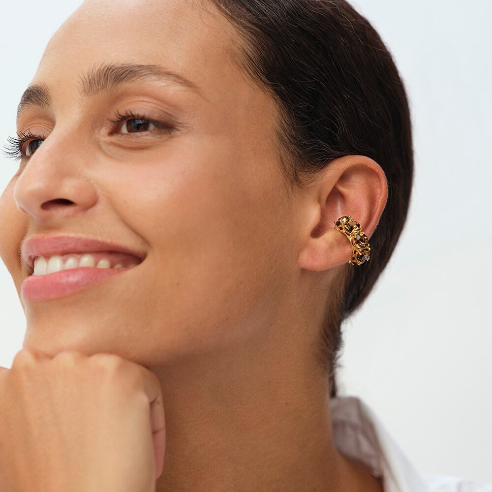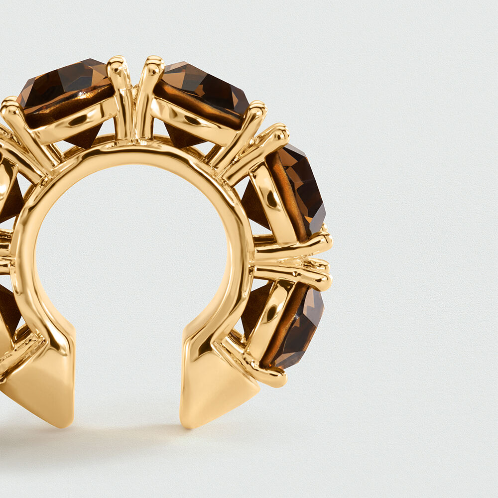 Ce earcuff de notre collection LUTETIA, imaginé à Paris, est réalisé en laiton doré à l'or 750/1000e - 18 carats, et orné de gemmes de verre.Inspiré de l'Art Déco, il se distingue par de somptueux gemmes de verre de grande taille aux teintes fumés.