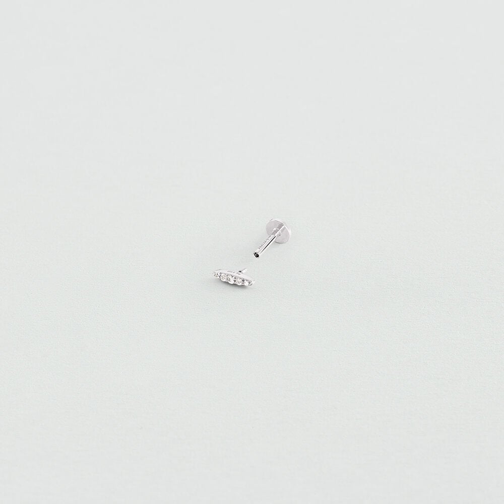 Piercing en argent rhodié avec tige en acier inoxydable, orné d’un motif ovale allongé au design épuré. Le motif est à visser sur une tige de 6 mm.
