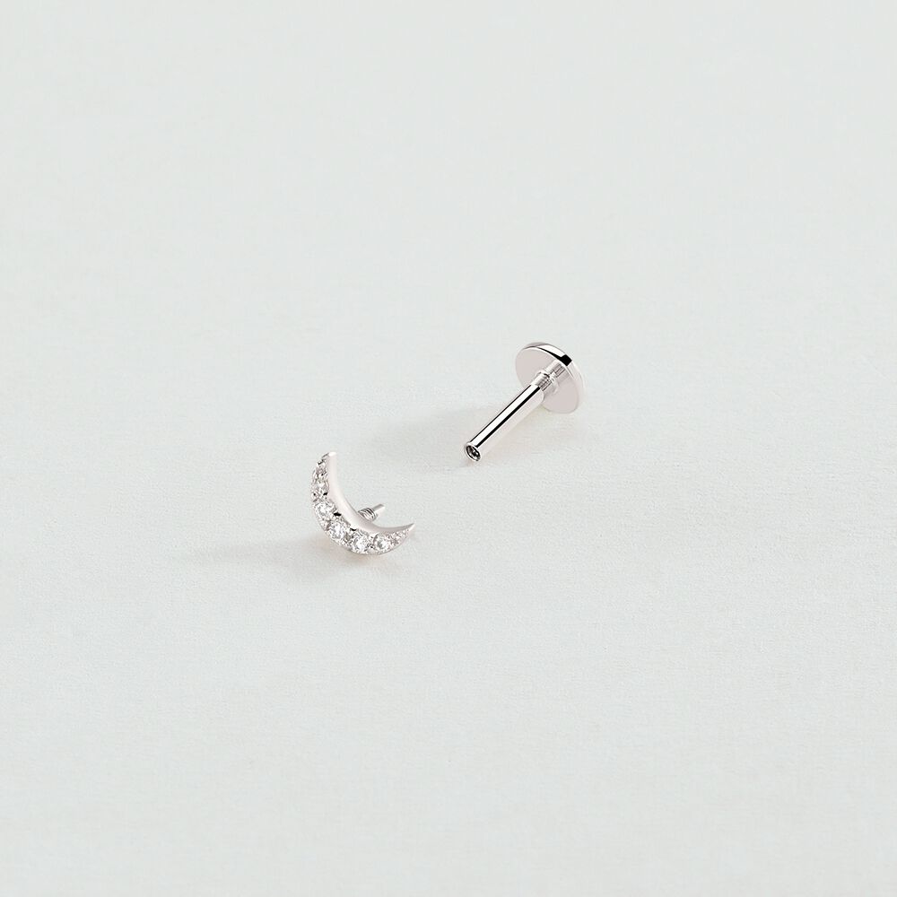 Piercing puce, en argent rhodié et tige en acier inoxydable, mini lune pavée d'oxydes de zirconium. Le motif est à visser sur une tige de 6mm..