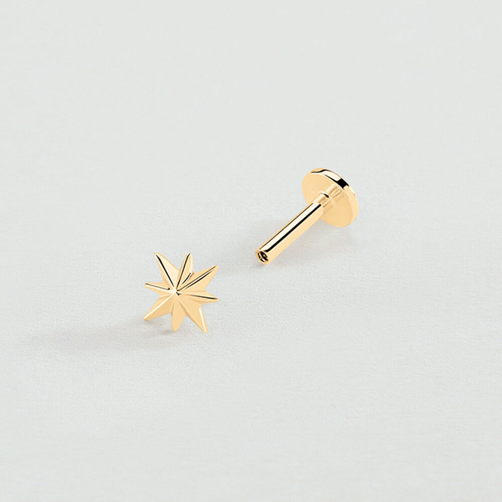 Piercing puce étoile de notre concept MIX & MATCH réalisé en argent 925 doré à l'or 750/1000e - 18 carats. Le motif est à visser sur une tige de 6 mm. La tige et le fermoir à vis de ce piercing sont en acier inoxydable, un métal particulièrement adapté et recommandé pour les piercings au cartilage. Ce modèle peut être porté sur le lobe, l'hélix, le rook ou le tragus. Vendu seul, pour mieux les mixer et les accumuler.