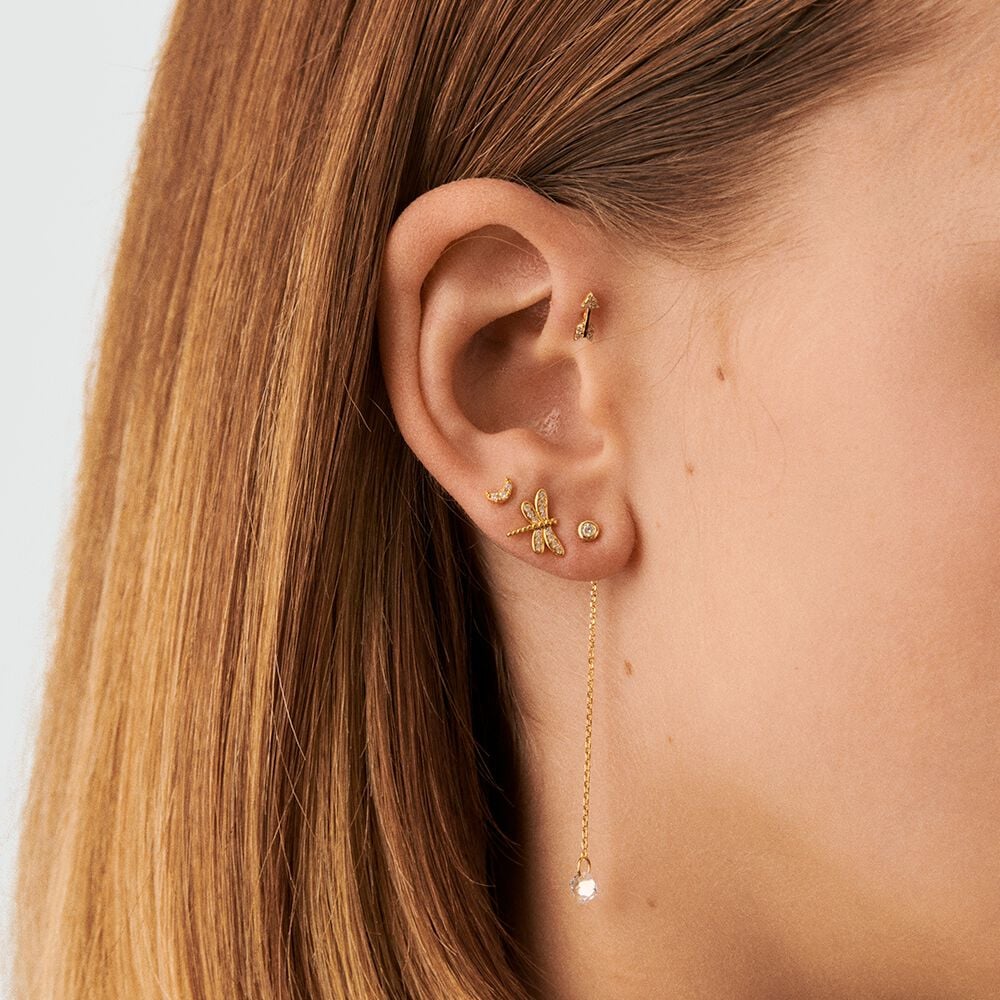 Boucle d'oreille puce boule et chaine accrochée au papillon avec un oxyde de zirconium en forme de coussin percé au bout de la chaine, en argent véritable doré 750/1000. A l'unité pour mieux les mixer et les accumuler.