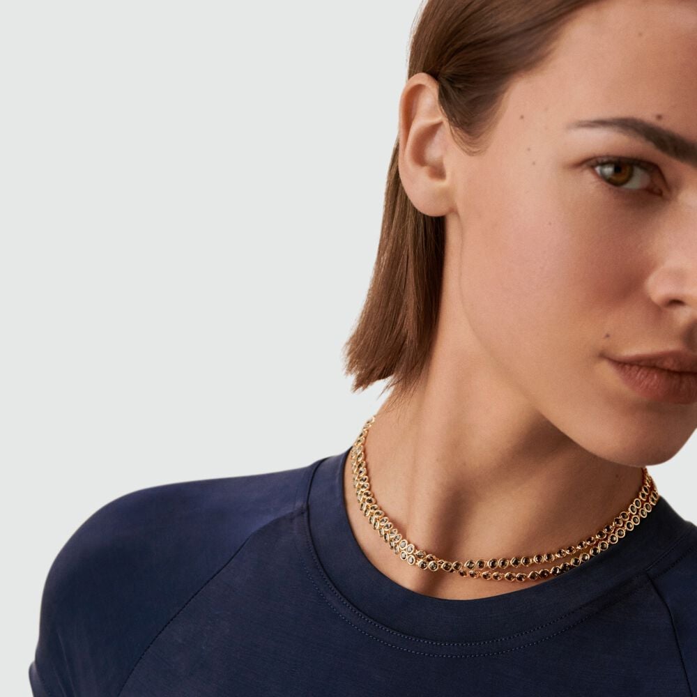 Sautoir, en laiton doré 750/1000, chaine tennis d'oxydes de zirconium sertis clos. Il peut également se porte en collier court double rang..