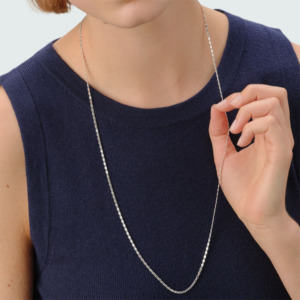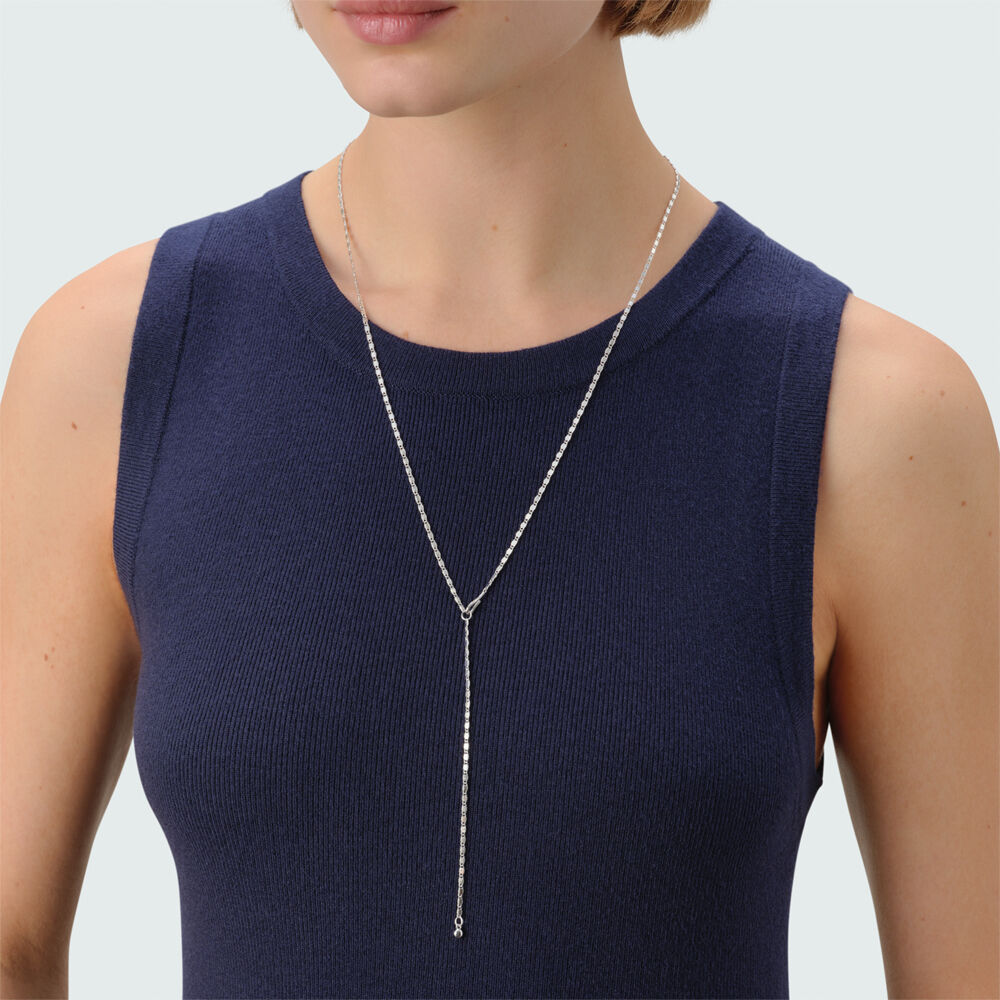 Collier double rang Y de notre collection JUSSIEU, imaginé à Paris, réalisé en laiton argenté rhodié. Cette chaine miroir offre un look chic, tout en discrétion.