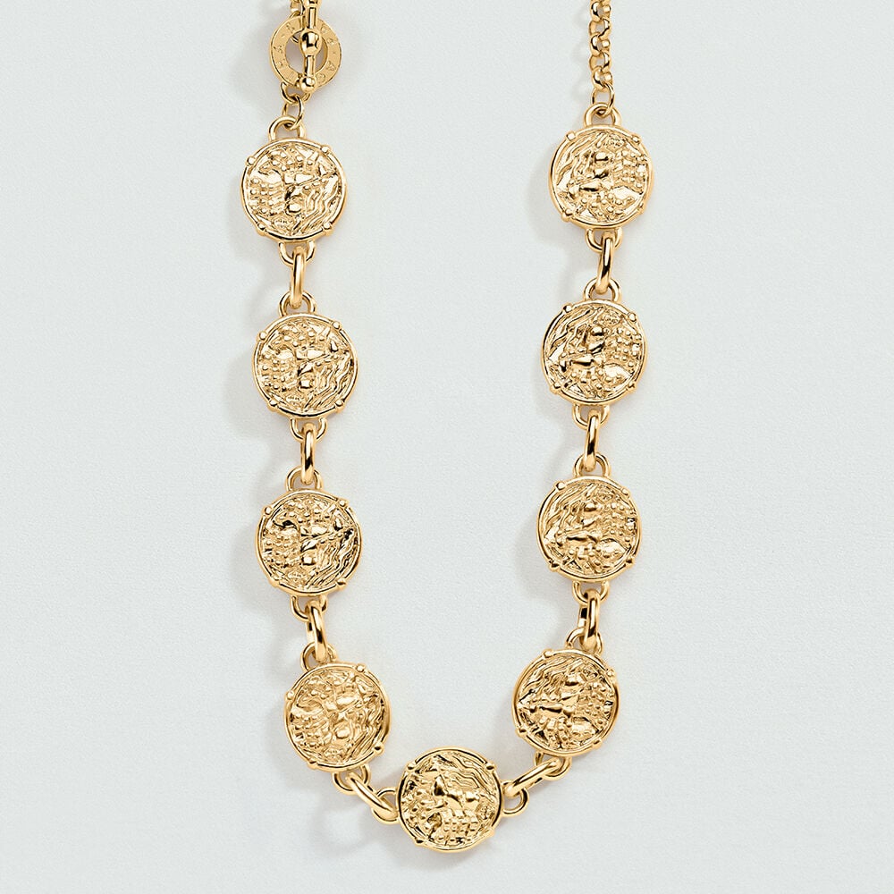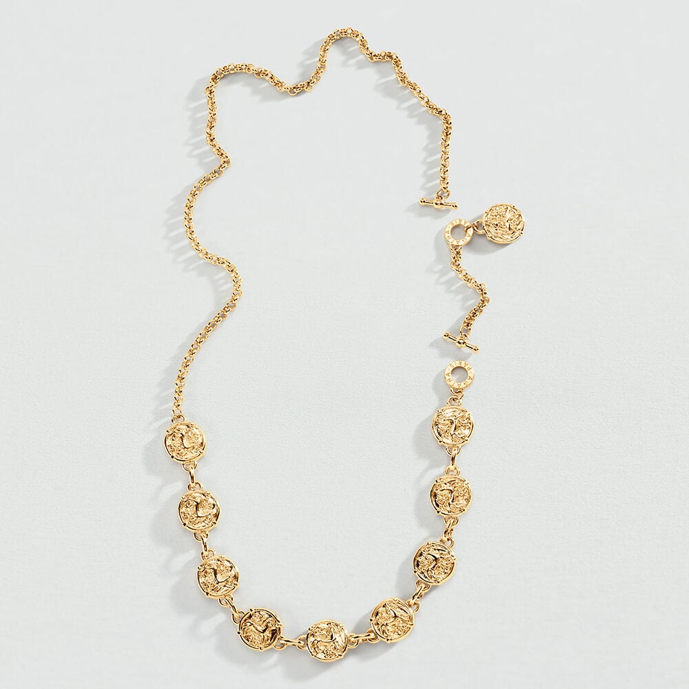 Ceinture en métal doré à l'or fin avec des médailles symbolisant un cheval. Ce bijou mesure 990mm et contient une rallonge de 80mm