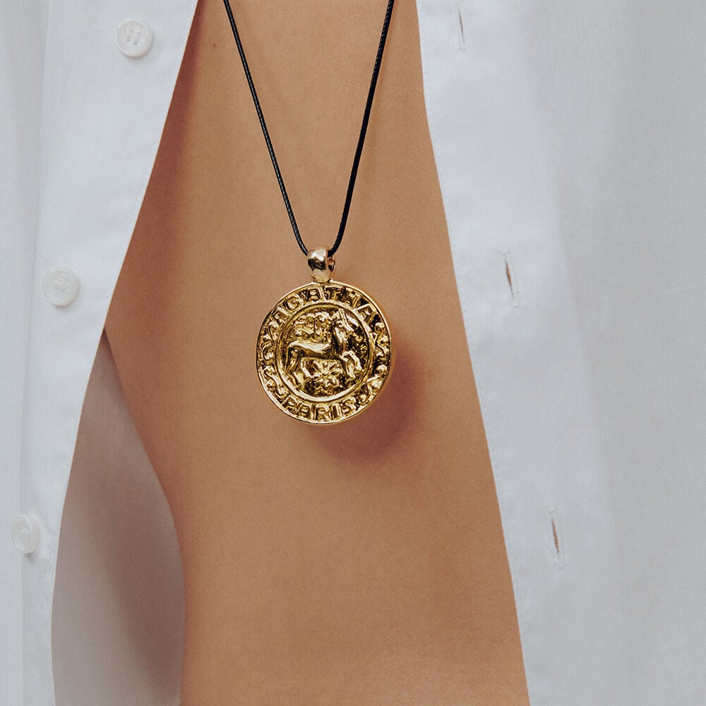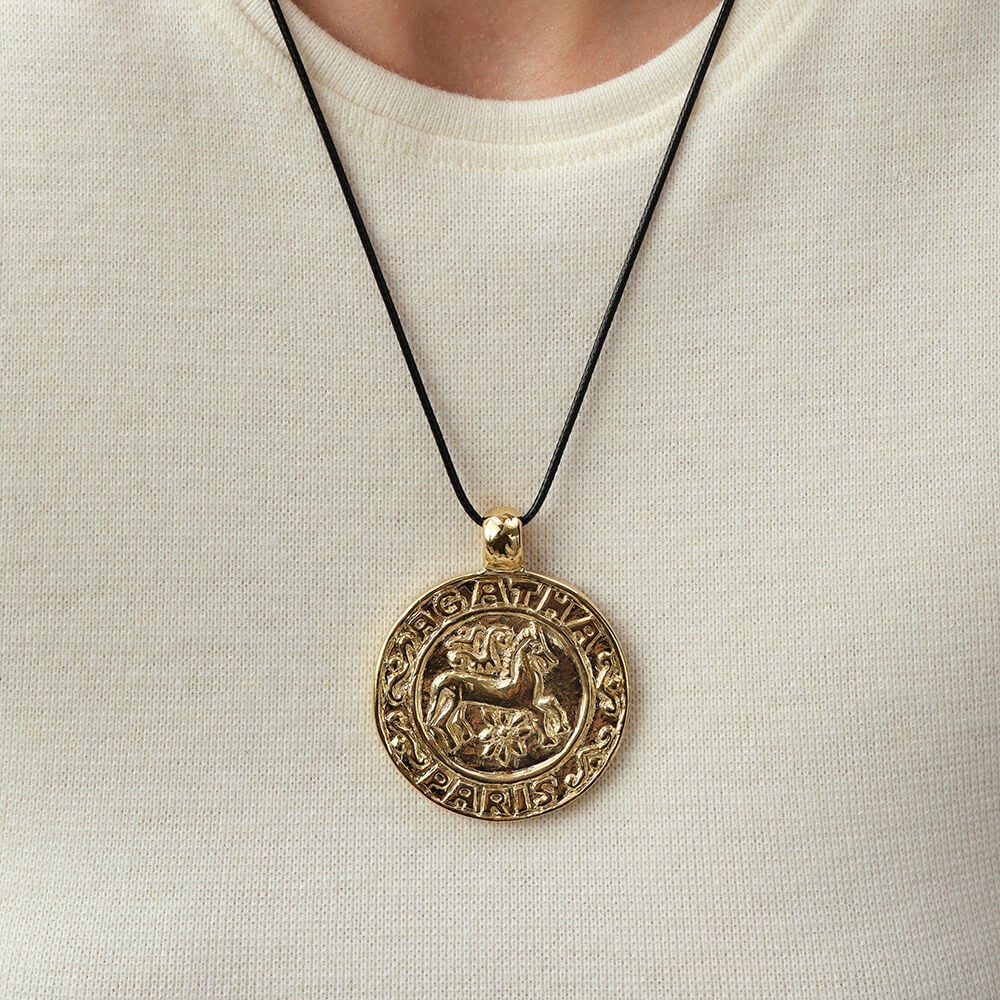 Collier en coton ciré et métal doré à l'or fin avec une médaille symbolisant un cheval.