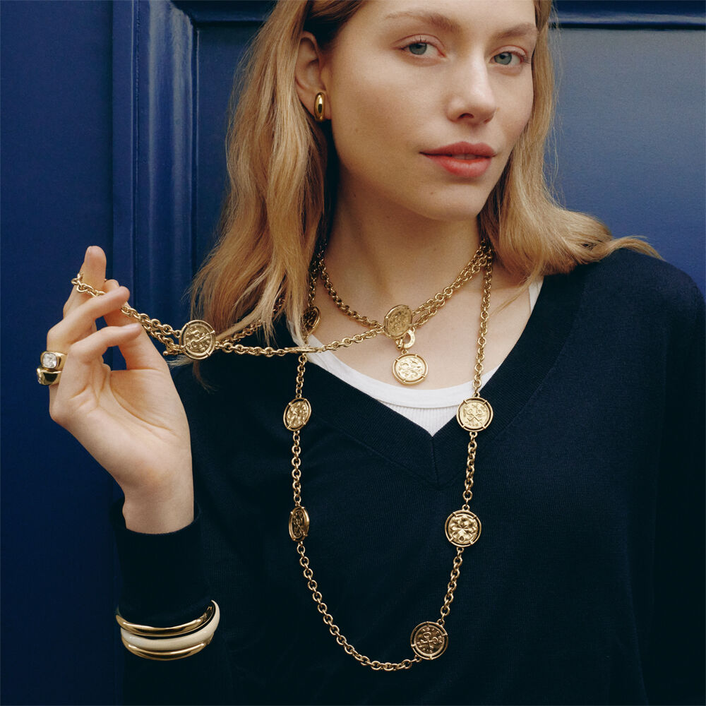 Sautoir, en étain doré 750/1000, médailles avec 2 clés croisées d'un côté et le cycle lunaire de l'autre sur chaine, fermoir bâton logotypé. Fabriqué dans nos ateliers parisiens, chaque pièce de la ligne St Honoré est minutieusement dessinée, sculptée à la main, dorée par un procédé artisanal, puis assemblée manuellement pour garantir une qualité et une durabilité optimales. Un bijou unique qui porte l’héritage et l’élégance intemporelle d’Agatha. Les médailles font 25 mm de diamètre.