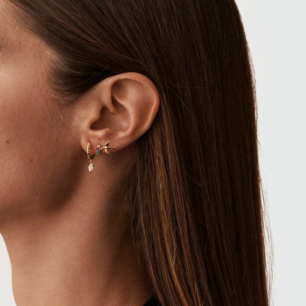 Créole torsadée, oxyde de zirconium en forme de navette en pampille, en argent doré 750/1000. A l'unité, pour mieux les mixer et les accumuler.