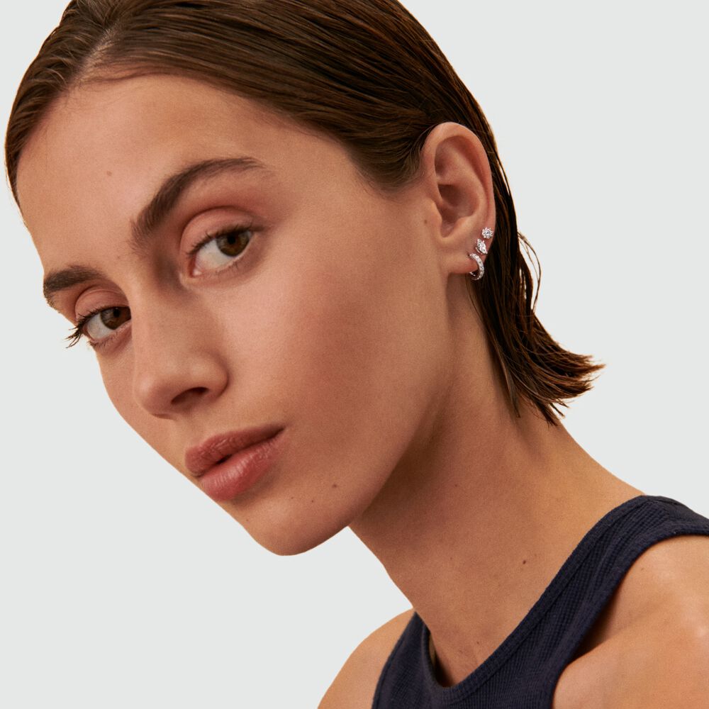 Set de 3 boucles d'oreilles : une créole et une fleur pavées d'oxydes de zirconium et un oxyde de zirconium navette griffé, en argent véritable..